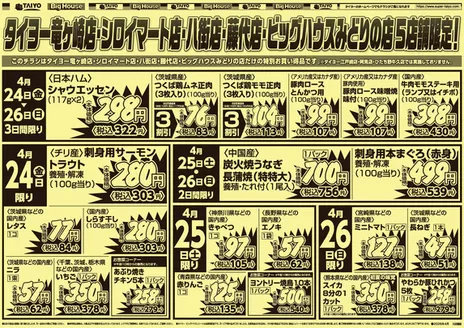 四街道市のタイヨーのチラシとお買い得商品タイヨーは鹿児島県と宮崎県に展開する食品スーパーマーケットチェーン。騎射場、高城などに店舗を構えています。株式会社タイヨーが運営。本社は鹿児島県鹿児島市です。 タイヨーの営業時間、住所や駐車場情報、電話番号はTiendeoでチェック!
